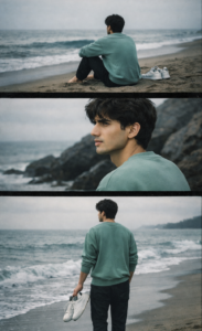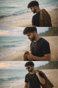 A vertical triptych (three-panel layout)featuring a young man with curly dark hair on a serene beach. In the top panel, he stands facing the ocean with a brown jacket draped over one shoulder, looking down thoughtfully; handwritten white font across the sky. In the middle panel, he is shown from the waist up, adjusting the brown jacket in his hands while looking toward the sand. In the bottom panel, he is captured mid-motion, walking along the shoreline with the jacket slung over his shoulder, catching the breeze. He is wearing a black t-shirt, a silver chain necklace, and sunglasses. The background features soft blue skies, gentle white-capped waves, and a tan sandy beach. The lighting is soft and natural, creating a moody, cinematic, and aesthetic lifestyle atmosphere, 100% my face same, I need this prompt picture, this picture don't every text, zoom 4:5,