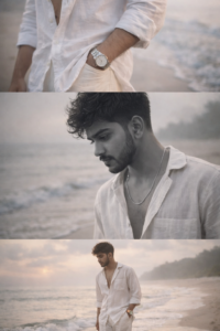 A cinematic three-panel vertical collage featuring a young man with voluminous dark hair and a beard, misty beach. The first panel is a focused detail shot of his torso in a relaxed, unbuttoned white linen shirt and matching trousers, highlighting a silver wristwatch. The middle panel is a soulful black-and-white portrait of his face and neck, featuring a thin silver chain and a moody expression. The bottom panel is a wide-angle shot of him walking along the shoreline at golden hour, with soft waves crashing in the background. The overall aesthetic is high-fashion editorial, with ethereal natural lighting and a dreamy, melancholic atmosphere." 100% my face same, I need this prompt picture, zoomb