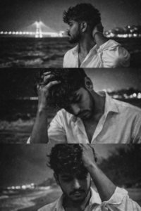 A vertical three-panel film strip collage in high-contrast black and white. Cinematic night photography at a beach. A young man with messy, wavy hair wearing a crisp white button-down shirt. [Top Panel]: Side profile, looking out at a glowing suspension bridge and city lights over dark ocean waves, hand resting on the back of his neck. [Middle Panel]: A candid shot with slight motion blur, the man looking down and adjusting his hair. [Bottom Panel]: Front view, face partially obscured by his hand running through his hair, looking down. Moody, grainy film aesthetic, low light, deep shadows, 4:5 aspect ratio, 100% my face same, I need this prompt picture, zoom in 4:5,