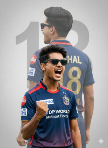 Create a high-quality sports poster of him wearing an official Royal Challengers Bangalore (RCB) red and navy jersey. Apply a double exposure effect: foreground celebrating with clenched fist (face unchanged), background faded back view with name "Vishal” and number “18” on the jersey.