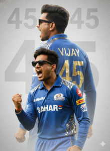 Create a high-quality sports poster of him wearing an official Mumbai Indians (MI) blue jersey. Apply a double exposure effect: foreground celebrating with clenched fist (face unchanged), background faded back view with name “RAJU” and number “45” on the jersey.