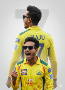 Create a high-quality sports poster of him wearing an official Chennai Super Kings (CSK) yellow jersey. Apply a double exposure effect: foreground celebrating with clenched fist (face unchanged), background faded back view with name “RAJU” and number “7” on the jersey.