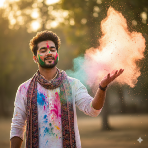 Ultra-realistic cinematic Holi portrait of a young man (early 20s) wearing a white kurta and a long scarf/dupatta, covered in colorful gulal powder. He raises one hand forward as bright color dust explodes in the air around him. Soft with eyes slightly closed, stylish messy hair, light beard. Outdoor background with dreamy bokeh, warm golden lighting, vibrant colors, shallow depth of field, dynamic particles, high contrast, 8K photorealistic, festival vibe.