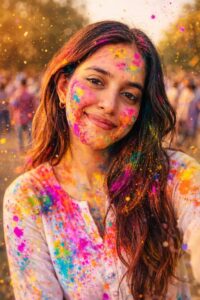 cinematic portrait of a young Indian woman celebrating Holi festival, colorful gulal powder (bright pink, yellow, blue, green, orange) naturally smeared and splashed on face, beard, hair and white kurta, soft golden hour sunlight, warm glowing skin tones, shallow depth of field, creamy bokeh background, festival crowd softly blurred behind, floating color dust particles in air, sharp focus on eyes, natural skin texture, detailed facial features, realistic beard texture, vibrant festival colors, DSLR photography, 85mm lens, f/1.8 aperture, high dynamic range, professional color grading, photorealistic, joyful expression, Instagram aesthetic, ultra high resolution, 8k detail