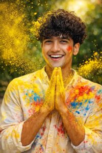 Ultra-realistic Holi festival portrait using my uploaded photo as the face reference, joyful young man smiling naturally, hands pressed together in front of chest covered in bright yellow Holi powder, vibrant yellow color powder exploding and flying across the frame, white button-up shirt splashed with multicolor paint stains (yellow, red, blue), red powder streak on one cheek, playful festive expression, dynamic powder particles frozen mid-air, outdoor garden background softly blurred with green foliage, bright natural daylight, warm tones, cinematic lighting, shallow depth of field, sharp focus on face, ultra-detailed skin texture, high shutter speed capture, 85mm lens, f/1.8, professional DSLR photography, vibrant colors, high contrast, 8K resolution, realistic fabric texture, energetic Holi celebration atmosphere, editorial photography style