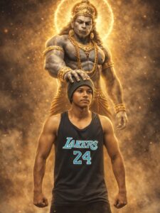 Ultra-realistic cinematic digital art of Lord Hanuman (Bajrangbali) standing behind a me, Hanuman blessing him by gently placing one hand on his head and make full photo. Lord Hanuman is tall, muscular, divine, grey stone-like skin, wearing golden crown (mukut), ornaments and dhoti, glowing golden aura and halo around his head, dramatic lighting.dust particles, smoky atmosphere, golden sparks floating in air. Hyper-detailed muscles, realistic skin texture, sharp focus. Cinematic composition, low angle shot, 8K ultra HD, high contrast, volumetric lighting, godly glow, masterpiece, unreal engine, ultra-realistic fantasy realism. And same to same no any change in body