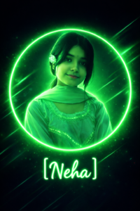 Create a neon aesthetic circular profile picture from portrait photo, green neon lighting, glowing ring border around circle, soft glow on face, dark background with light streaks, stylish name text "[YOUR NAME]" at bottom, Instagram neon DP style, cinematic lighting, high detail