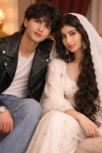 ULTRA-REALISTIC 8K PORTRAIT OF A STYLISH YOUNG MAN [KEEP IT REAL FACE FROM UPLOADED IMAGE] AN 17 YEARS OLD YOUNG MAN SITTING BESIDE HER ON THE SOFA WITH LOOKING AT THE CAMERA WITH SOFT SMILE EXPRESSION. ATTIRE & STYLING: YOUNG MAN: WEARING A A VINTAGE-STYLE BLACK LEATHER BIKER JACKET WITH SILVER HARDWARE AND AN ASYMMETRICALZIPPER, WORN OVER A WHITE TAN TOP UNDERNEATH. THE JACKET SHOULD HAVE REALISTIC LEATHER TEXTURE AND SUBTLE REFLECTIONS. BOTTOMS: LIGHT-WASH, WIDE-LEG BAGGY DENIM JEANS WITH A SLIGHTLY DISTRESSED HEM, NATURAL FOLDS AND FABRIC REALISM. FOOTWEAR: POLISHED BLACK LEATHER SQUARE-TOE BOOTS, SLIGHTLY VISIBLE, WITH REALISTIC SHINE AND DETAILING. ACCESSORIES: A MINIMALIST SILVER WRISTWATCH ON THE LEFT WRIST, CLEAN AND SUBTLE DESIGN. HAIRSTYLE: VOLUMINOUS, MESSY DARK WAVY HAIR AND A CLEAN TAPER FADE ON THE SIDES AND THE BACK OF THE HAIR IS LONG AND FLOWS DOWN TO THE NAPE OF THE NECK, WITH REALISTIC TEXTURE AND MOVEMENT. A STUNNING YOUNG INDIAN WOMAN WITH LONG, VOLUMINOUS WAVY DARK HAIR. SHE HAS A SERENE AND ROMANTIC, SOFT SMILE EXPRESSION, LOOKING AT THE CAMERA. SHE FEATURES SOFT, NATURAL MAKEUP WITH WARM-TONED EYESHADOW AND A SMALL, DELICATE MOLE NEAR HER CHIN. ATTIRE & ACCESSORIES: SHE IS WEARING A TRADITIONALIVORY-WHITE COTTON SALWAR KAMEEZ OR DUPATTA DRAPED OVER HER HEAD. THE FABRIC FEATURES DELICATE FLORAL EMBROIDERY AND A DISTINCTIVE PINK SCALLOPED (ZIGZAG) BORDER. SHE IS WEARING LARGE, ORNATE PEARL-DROP HOOP EARRINGS AND HAS WHITE WIRED EARPHONES PLUGGED INTO HER EARS, CREATING A "MODERN-MEETS-VINTAGE" VIBE. BOTH SUBJECTS SITTING CLOSE, RELAXED POSTURE, SOFT NATURAL EXPRESSIONS, PERFECTLY MATCHING LIGHTING AND SHADOWS. SETTING: AN INDOOR, UPSCALE SETTING-LIKELY A WEDDING OR A FORMAL FAMILY EVENT. THERE IS A PLUSH TUFTED BEIGE SOFA AND RICH MAROON CURTAINS IN THE BACKGROUND. LIGHTING & COMPOSITION: SOFT, DIRECTIONAL LIGHTING THAT HIGHLIGHTS THE TEXTURES OF THE FABRIC. THE COMPOSITION IS A MEDIUM SHOT FOCUSING ON THE INTERACTION AND BODY LANGUAGE, AR-3:4