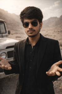 charismatic, young man with dark, same hair like in the photo and gold-rimmed aviator sunglasses. He is wearing a stylish black suit jacket over a black traditional tunic (shalwar kameez). He has a slightly smirking or confident expression and is gesturing outwards with both open palms in a 'what can you do? pose. He is standing in a dusty desolate desert or mountainous terrain. 77 A partial view of a white, vintage off-road vehicle (like a Land Cruiser)is visible to his left. The lighting is bright and harsh, creating a dramatic, cinematic feel, captured in high-4 quality resolution. Preserve Face 100% 750