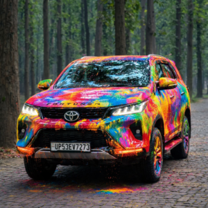 Ultra realistic 4K cinematic photo of my car fully covered in vibrant Holi colors. Bright pink, blue, yellow, green and orange gulal only on the car body (roof, bonnet, doors, mirrors, tyres). Background clean and natural, no colors in background. Wet color texture, glossy reflections, detailed powder particles, sharp focus, festive Holi vibe, professional photography.